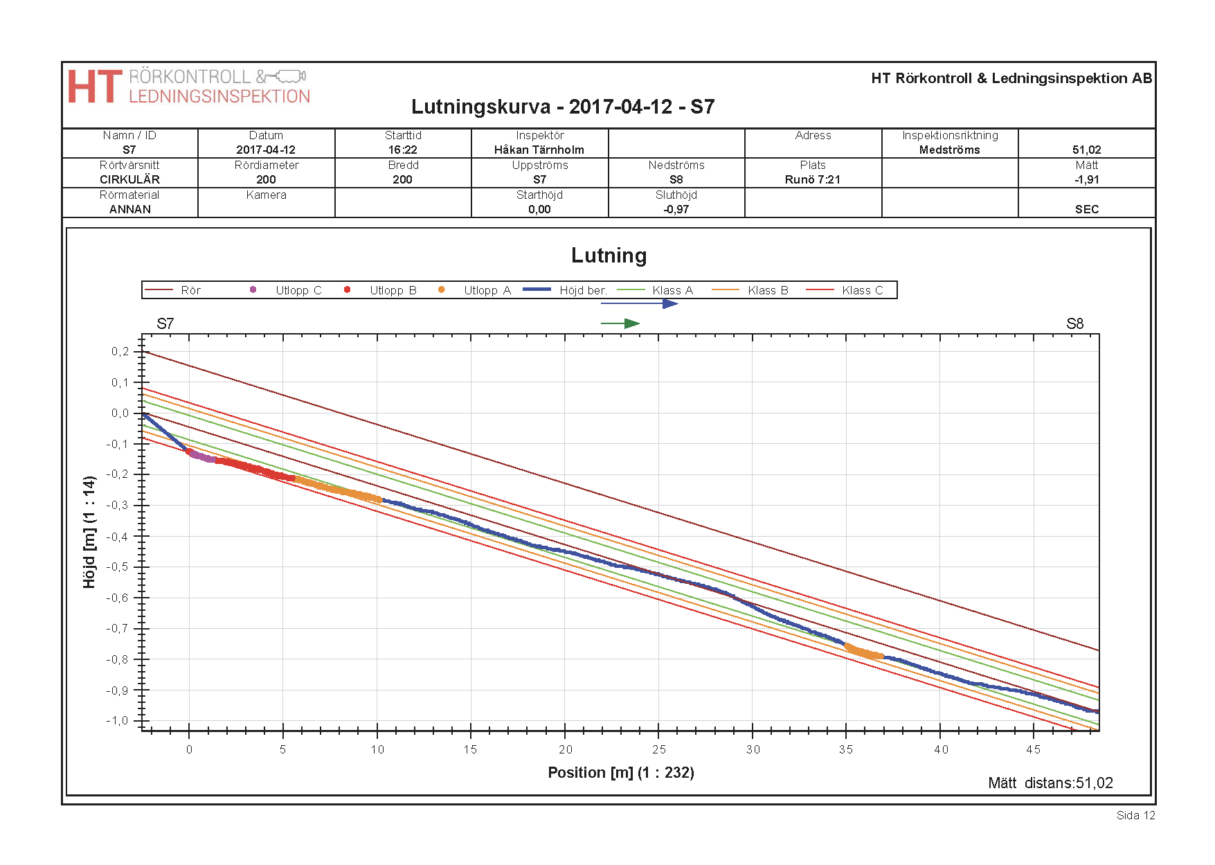 Lutningsmätning även kallat Riktningsavvikelse gör vi med kameravagnen som körs i ledningen mellan till exempel två brunnar, då vagnen har registrerat framåt eller bakåtlutning sammanställs sedan ett protokoll med en linje där hela sträckan presenteras. Där kan man lätt se om sträckan innehåller bakfall eller svackor. Det går även att lägga in dem verkliga brunnshöjderna för att få ett mer exakt resultat.